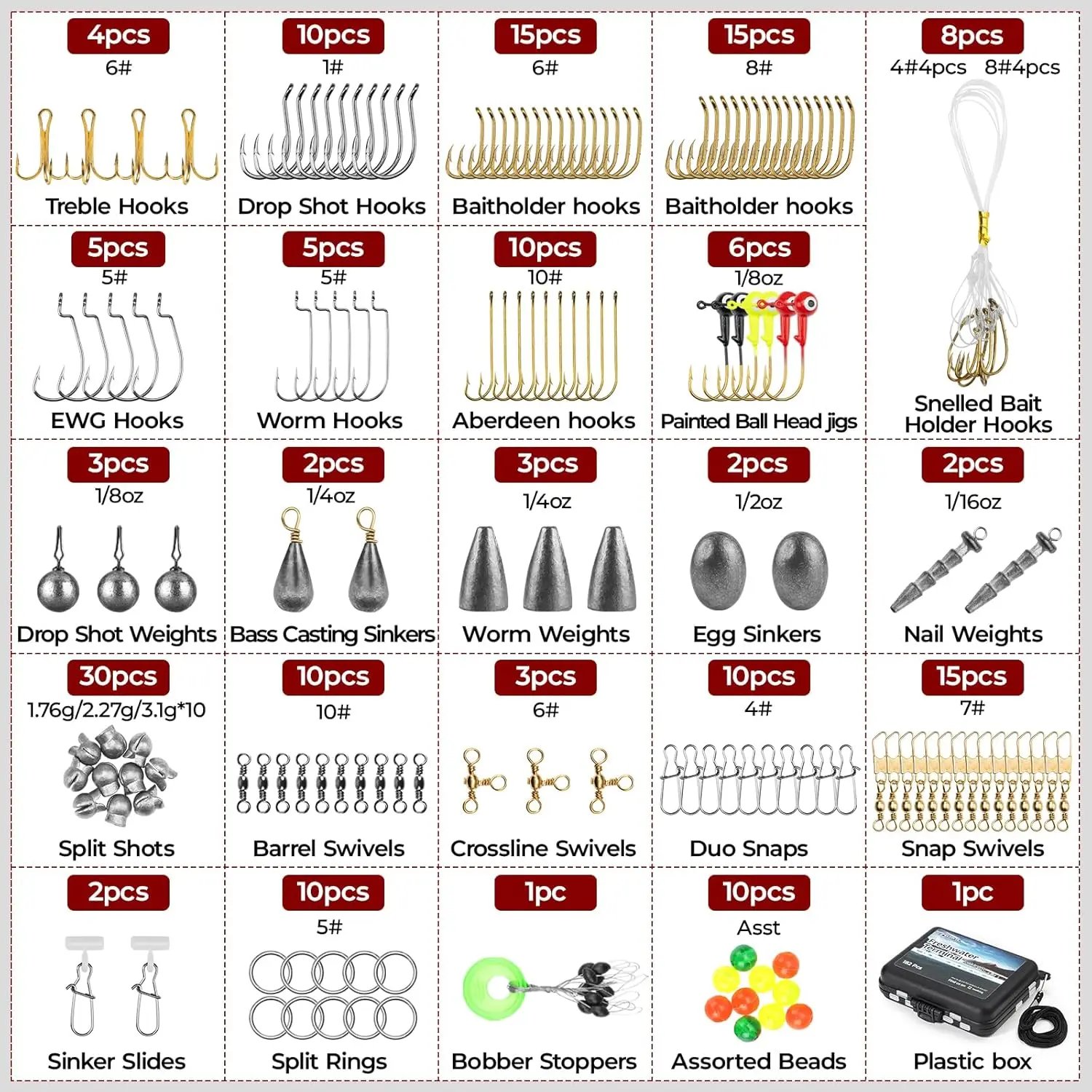 Includes hooks, pre-tied snelled hooks, fishing jigs, weights, sinkers, swivels, snaps, bobbers, and more. Perfect for bass, trout, walleye, panfish, crappie, catfish, and more.