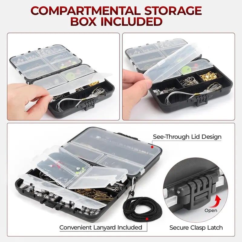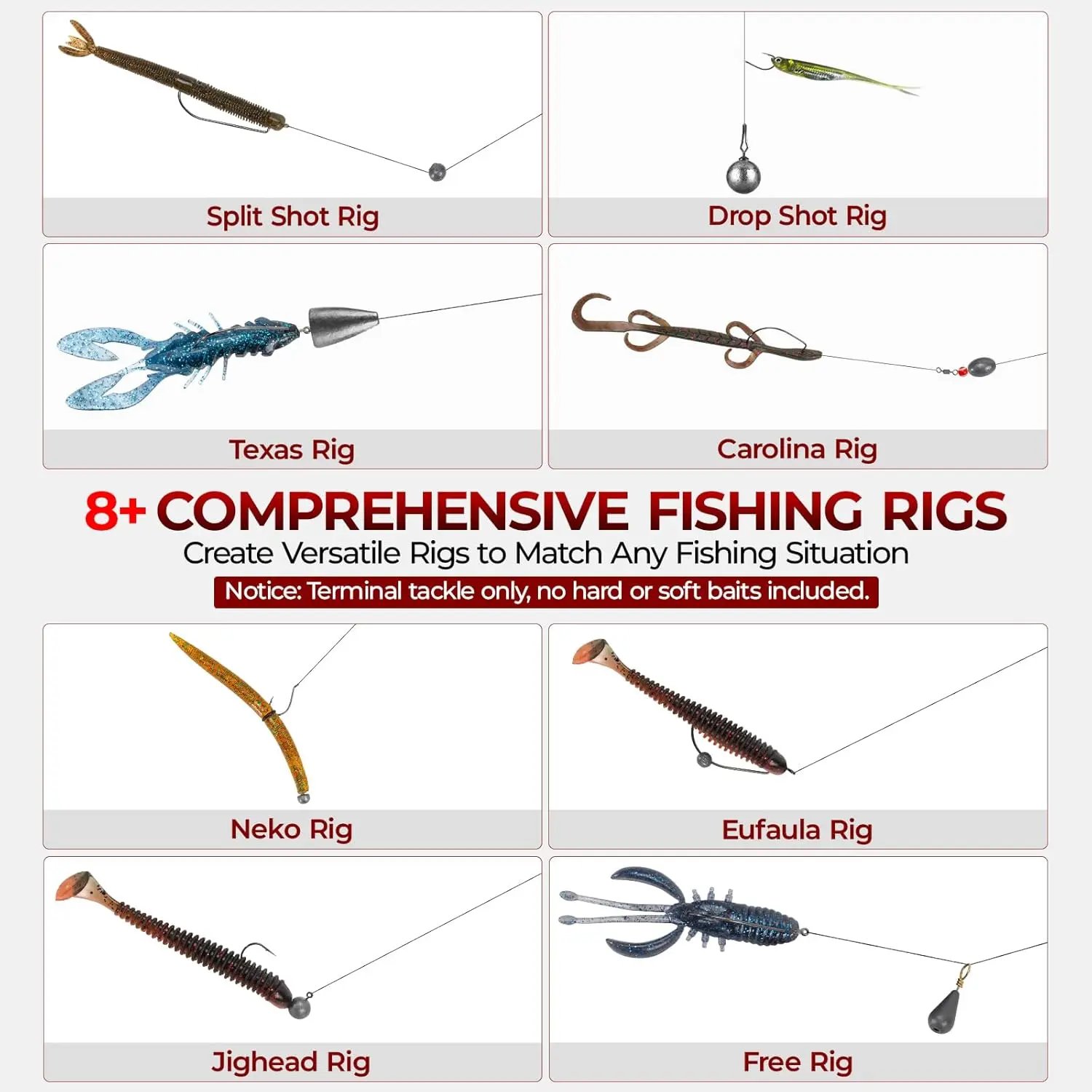 Equipped with 5 premium hook styles: EWG worm hooks, round bend worm hooks, wide gap wacky hooks, light wire finesse hooks, and drop shot hooks for maximum versatility.
